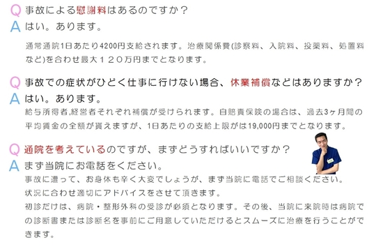 身体の重心の位置が事故によりずれると様々な症状が出てきます。 当院は姿勢検査により体型をパターンに分類をしていきます。また身体全体の連動状態を把握し、独自の検査により原因を追究していきます。