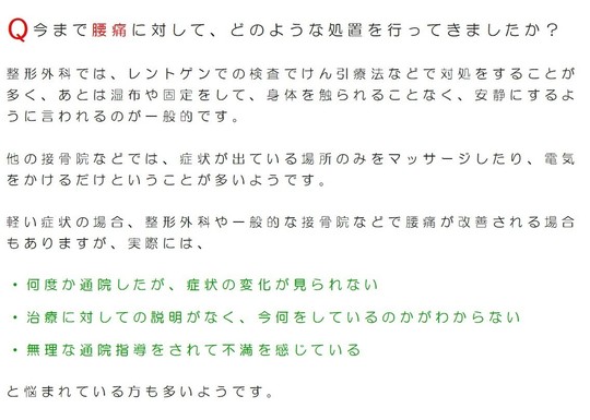 当院は患者さまのお身体を全体構造的な考えに基づき、現在の状態はどれだけ逸脱してしまっているかを判断し、機能していない個所を見つけ、局所と全体が本来の動きを取り戻していけるよう検査し、原因を特定致します。