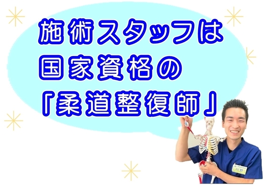 施術者は全員国家資格者です。専門的で幅広い知識を持ち、厚生労働省から特別に認可を受けた『柔道整復師』が施術を担当いたします。